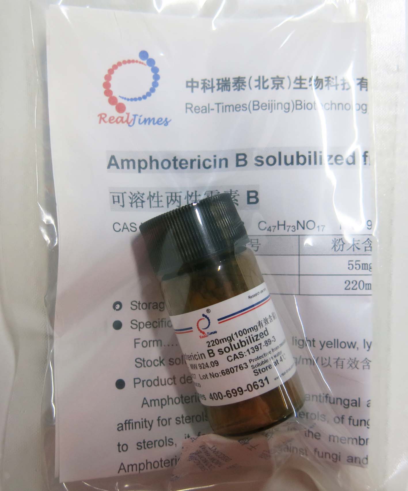 Amphotericin B is a polyene antifungal antibiotic from Streptomyces sp. It has a high affinity for sterols, primarily ergosterols, of fungal and bacterial cell membranes. After binding to sterols, it forms channels in the membranes, causing small molecules to leak out. Amphotericin B is effective against fungi and yeast. Normal usage for maintenance of cell cultures is 2.5 mg/l with penicillin and streptomycin in the medium. For cultures already contaminated with yeast and fungus, it is recommended to use this product at 2-4 times the normal level (5-10 mg/l), without penicillin and streptomycin for 2-3 subcultures. Once the infection is under control, normal maintenance levels of amphotericin B should be used. Amphotericin B is not soluble in H2O but in DMSO. Amphotericin B solubilized is a colloidal suspension of Amphotericin B, using sodium deoxycholate as the solubilizing agent. The product is approximately 45% amphotericin B, 35% sodium deoxycholate; the balance being sodium phosphate and sodium chloride.