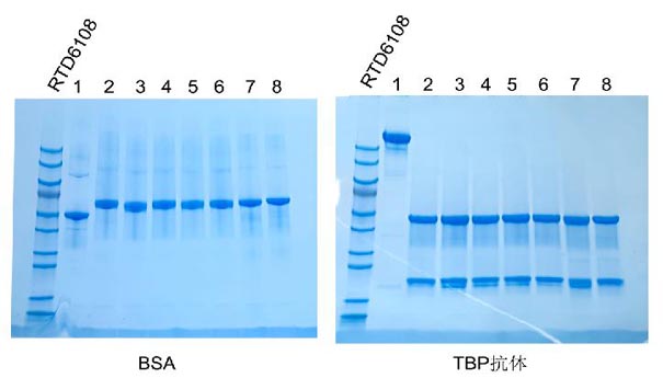 2 TBP單抗變性非還原為一條帶,大小大于180kD,變性還原后為兩條帶