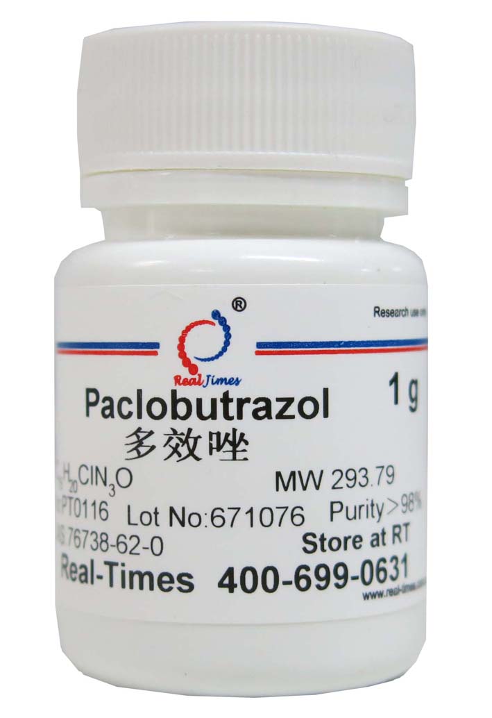 說(shuō)明:Paclobutrazol is a triazole type plant growth retardant which blocks gibberellin biosynthesis and are involved in reducing abscisic acid, ethylene and indole-3-acetic acid while increasing cytokinin levels. It promotes fruit set in the states of inhibited development . It is also known that it protect plants against abiotic stresses.