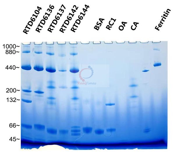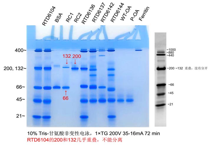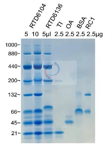 2. 非變性蛋白電泳Marker由于要保持蛋白的天然結(jié)構(gòu),都沒有偶聯(lián)染料,在電泳時(shí)基本都看不到條帶;但是RTD6104中的440