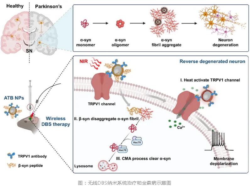 基于此,研究團隊設計了一種光熱無線DBS納米系統(tǒng),命名為ATB NPs。這一系統(tǒng)通過直接刺激神經(jīng)元內源性表達的熱敏TRPV1受體,實現(xiàn)對退化神經(jīng)元的精準調控。該系統(tǒng)由三個核心模塊組成:光熱轉換模塊(金納米殼AuNSs),用于激活熱敏TRPV1離子通道;靶向模塊(TRPV1抗體),靶向高表達TRPV1受體的多巴胺能神經(jīng)元;降解模塊(β-syn多肽,含近紅外響應連接體),通過結合α-syn的非淀粉樣蛋白-β成分疏水結構域,降解α-syn纖維。通過立體定位技術將ATB NPs注射至PD小鼠的黑質后,ATB NPs借助TRPV1抗體錨定在多巴胺能神經(jīng)元表面。在808 nm脈沖近紅外激光照射下,ATB NPs作為納米天線進行光熱轉換,激活熱敏TRPV1受體,引起Ca2+內流和動作電位產(chǎn)生。同時,ATB NPs釋放β-syn多肽,并通過激活分子伴侶介導的自噬途徑,清除α-syn聚集體,從而減少病理性纖維。最終,ATB NPs恢復了多巴胺能神經(jīng)元的交互網(wǎng)絡及多巴胺釋放能力,改善PD小鼠的運動功能。該無線DBS納米系統(tǒng)的優(yōu)勢主要包括:利用黑質多巴胺能神經(jīng)元內源性表達的TRPV1受體,無需植入神經(jīng)電極或進行基因操作;結合近紅外激光技術,能夠對特定腦區(qū)的退行性神經(jīng)元實現(xiàn)精準的時空調控;無線DBS納米系統(tǒng)具有良好的生物安全性。這種基于納米顆粒的無線DBS治療策略為帕金森病及其他神經(jīng)退行性疾病的治療提供了新思路。