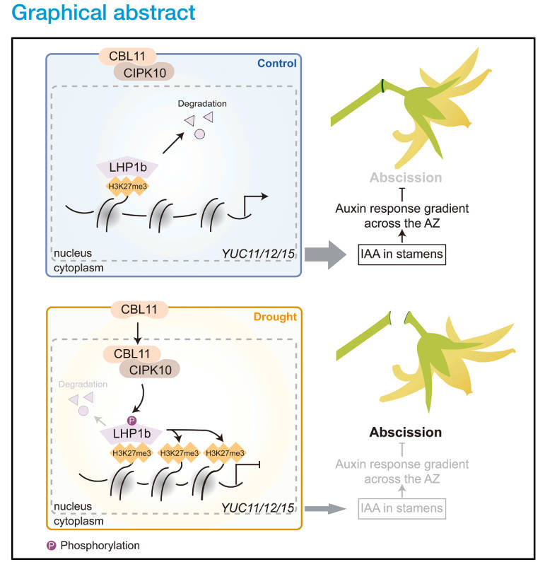 該研究發(fā)現(xiàn),干旱脅迫下SlCBL11/SlCIPK10-SlLHP1b信號模塊誘導(dǎo)番茄落花的作用機制。干旱脅迫激活SlCBL11-SlCIPK10鈣離子感受器模塊,磷酸化修飾SlLHP1b。磷酸化的SlLHP1b通過H3K27me3依賴的方式結(jié)合下游生長素合成基因SlYUCs的啟動子區(qū)域抑制其表達(dá),導(dǎo)致雄蕊中生長素合成減少,破壞離區(qū)生長素梯度,誘發(fā)番茄落花。該研究揭示了干旱下鈣信號通過表觀遺傳調(diào)控生長素合成參與番茄落花的分子機制,進(jìn)一步完善了植物逆境響應(yīng)中鈣信號與表觀遺傳調(diào)控的分子網(wǎng)絡(luò),還為培育耐旱、高產(chǎn)的品種提供了潛在的基因靶點。研究成果對提高逆境下的番茄產(chǎn)量,提高經(jīng)濟(jì)效益具有重要的指導(dǎo)意義。該研究獲國家重點研發(fā)計劃項目、國家自然科學(xué)基金面上項目和青年科學(xué)基金等項目支持。
