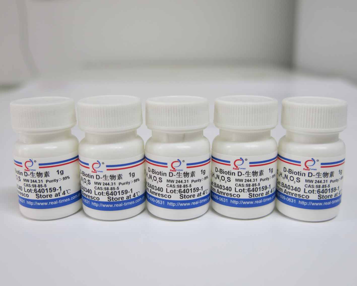 說明:A small biomolecule, 244Daltons, that has high binding affinity to avidin and streptavidin often used to label antibodies and enzymes. Several molecules of biotin can react with a single protein molecule to increase the sensitivity at the site of detection in ELISA, immunohistochemistry and Western Blotting.