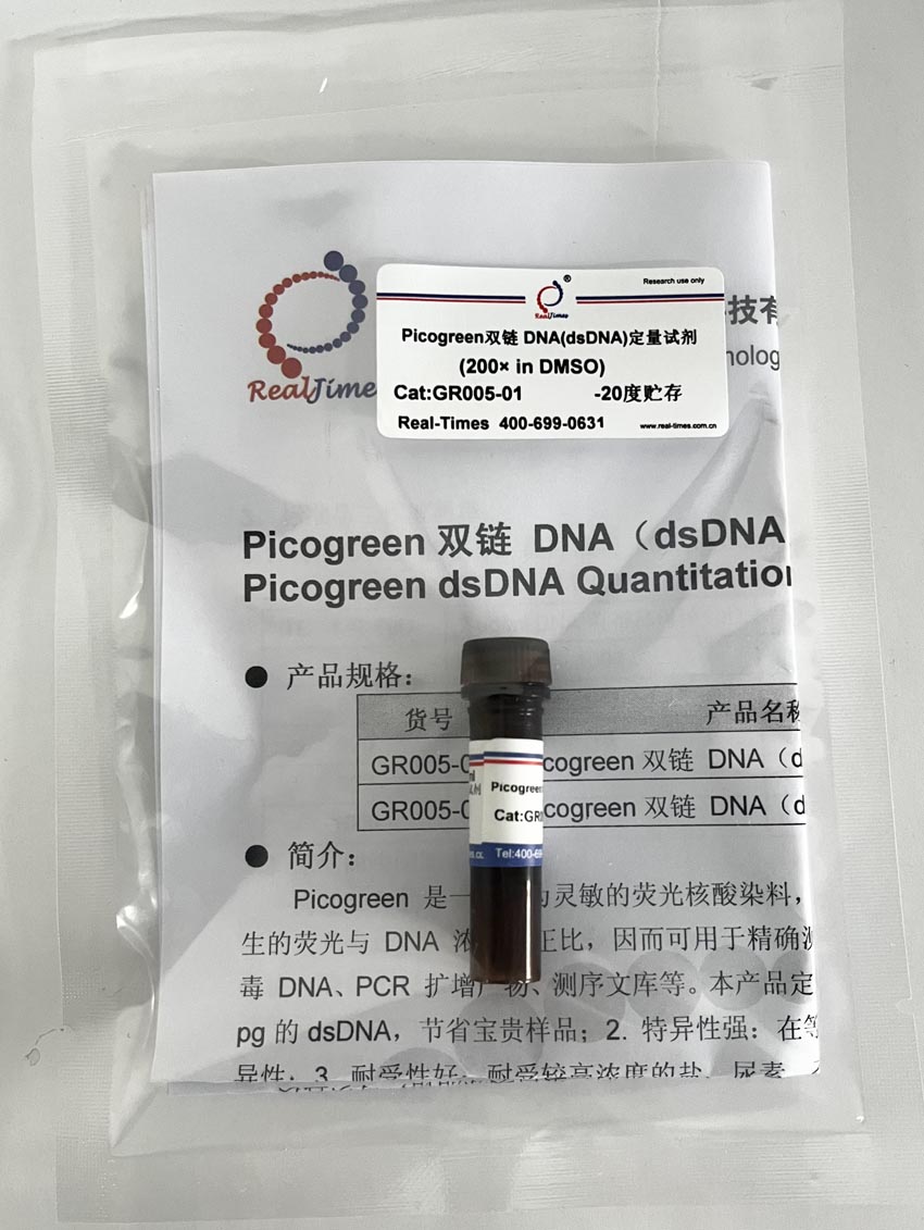 Picogreen 是一種極為靈敏的熒光核酸染料,其僅在與DNA 雙鏈結(jié)合后才發(fā)出熒光,且所產(chǎn)生的熒光與 DNA 濃度呈正比,因而可用于精確測量多個來源的 dsDNA,包括基因組 DNA、病毒 DNA、PCR 擴增產(chǎn)物、測序文庫等。本產(chǎn)品定量具有以下優(yōu)勢:1. 靈敏度高:可檢測低至200 pg的dsDNA,節(jié)省寶貴樣品;2. 特異性強:在等摩爾的RNA存在的條件下,對dsDNA具有特異性;3. 耐受性好:耐受較高濃度的鹽、尿素、乙醇、氯仿、去垢劑、蛋白或瓊脂糖,可以直接定量PCR擴增產(chǎn)物而無需從反應(yīng)混合物中純化DNA。4. 易于使用-只需在樣品中加入染料,等待5分鐘,然后讀數(shù)即可,且適用于96和384孔板;與大多數(shù)基于熒光的酶標儀和熒光計兼容。5. 適用范圍廣:可適用于PCR的分析、芯片樣品、DNA損傷分析、酶活分析、基因組DNA定量以及復(fù)雜混合物中dsDNA的檢測和病毒DNA定量等多種領(lǐng)域。