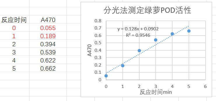 取0.5 克綠蘿葉片,加入5 ml提取液冰浴勻漿,制成10%勻漿液,12000 rpm 4℃離心10 min,取上清置于冰上;BCA蛋白定量試劑盒(貨號(hào):RTP7102)測(cè)定蛋白濃度為2 mg/ml;按照測(cè)定步驟操作,使用1 ml石英比色皿(光徑1 cm),設(shè)定分光光度計(jì)檢測(cè)波長(zhǎng)470 nm,間隔1 min記錄數(shù)據(jù),采集5次;時(shí)間對(duì)吸光值做線性回歸曲線,0-1 min線性較好,1 min內(nèi)△A=0.189-0. 055=0.126。酶活定義:每毫克蛋白(mg prot)每分鐘在1000 μl反應(yīng)體系中使 470 nm 處吸光值增加0.001為一個(gè)酶活力單位 U。