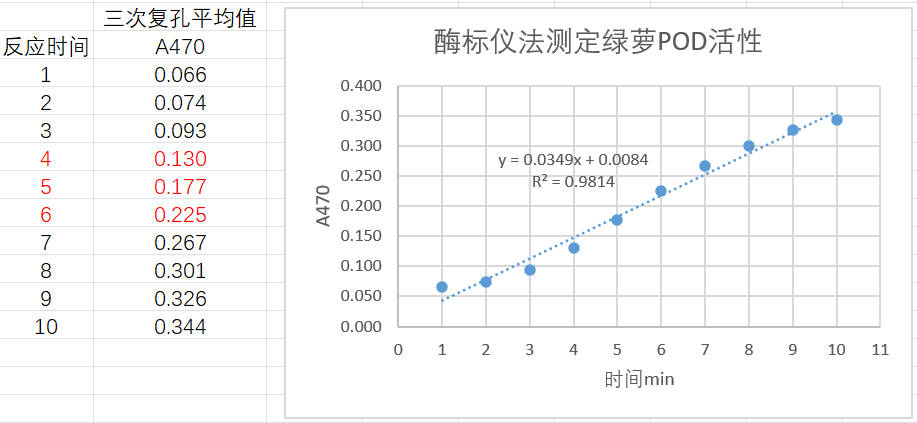 取0.5 克綠蘿葉片,加入5 ml提取液冰浴勻漿,制成10%勻漿液,12000 rpm 4℃離心10 min,取上清置于冰上,按照測定步驟操作,三個復孔,設定酶標儀檢測波長470 nm,間隔1 min采集數(shù)據(jù),采集10次;時間對吸光值做線性回歸曲線,4-6 min線性較好,2 min內△A=0.225-0.130=0.095。