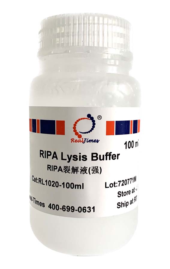 Buffer)是一種傳統(tǒng)的細胞組織快速裂解液。RIPA裂解液裂解得到的蛋白樣品可以用于常規(guī)的Western、IP等。RIPA的本意是Radio Immunoprecipitation Assay。RIPA裂解液的配方有很多種,根據(jù)其裂解液的強度大致可以分為強、中、弱三類。RIPA裂解液(弱)的主要成分為Tris (pH7.4),NaCl,1%