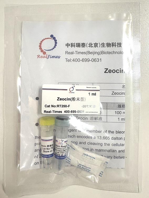 ble基因表達(dá)的細(xì)胞。與現(xiàn)在使用的其他動(dòng)物細(xì)胞標(biāo)記物無(wú)交叉抗性。因此這種抗生素可用來(lái)分離對(duì)其他篩選劑(如:慶大霉素,潮霉素)有抗性的克隆。Zeocin是一種屬于爭(zhēng)光霉素家族的糖蛋白抗生素,在體內(nèi)能作用于大多數(shù)細(xì)菌(包括E. coli)、真菌(如:酵母菌)、植物細(xì)胞、動(dòng)物細(xì)胞。