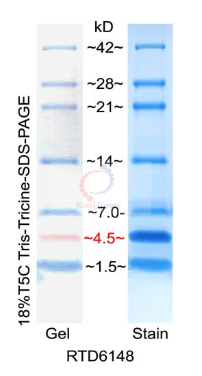 kD為紅色,其余條帶為藍(lán)色條帶,分子量大小為 ~1.5 kD,~4.5 kD(紅色),~7 kD, ~14 kD,~21 kD, ~28 kD,~42 kD??梢杂糜谥苯佑^察蛋白質(zhì)電泳狀況以及清晰地判斷Western Blot的轉(zhuǎn)膜效果。經(jīng)Tricine-甘油SDS-PAGE凝膠電泳時(shí)以及轉(zhuǎn)移到PVDF或NC膜上可看到清晰的7條顏色條帶。