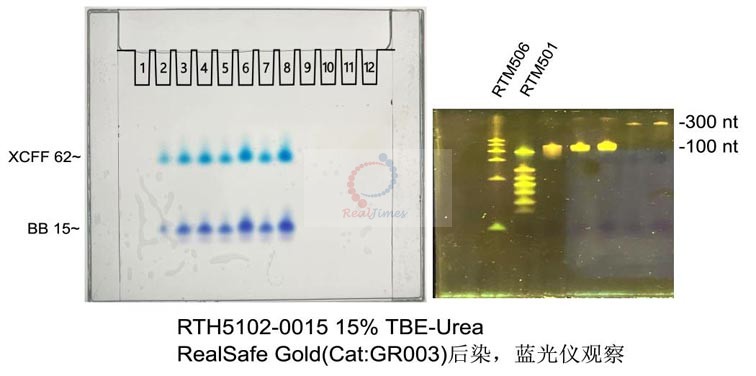單鏈DNA或RNA樣品可以用單鏈DNA PAGE電泳染色試劑盒(貨號:RTS5103),核酸PAGE電泳染色試劑盒(貨號:RTS5102)或核酸快速高靈敏度染色試劑盒(貨號:RTS5101)染色均可以得到清晰的條帶分離效果。注:如果使用核酸染料染色,RealSafe Red(貨號:GR002)或RealSafe All(貨號:GR004)核酸染料結(jié)合單鏈核酸效果最佳,強(qiáng)烈建議使用以便獲得最佳效果的膠圖。其余染料如GelRed,Goldview,EB等染色效果不好。