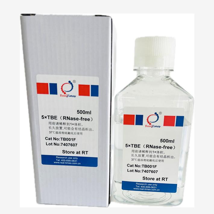 TBE 即 Tris-Borate-EDTA buffer ,5×TBE是 5 倍濃縮的 TBE。本產(chǎn)品是RNase-free的,使用時(shí)需用RNase-free水(DEPC水)(貨號(hào):RF001)稀釋 5 倍后再使用,1×TBE工作液中組份濃度:89 mM Tris,89 mM borate,2 mM EDTA,pH8.0。